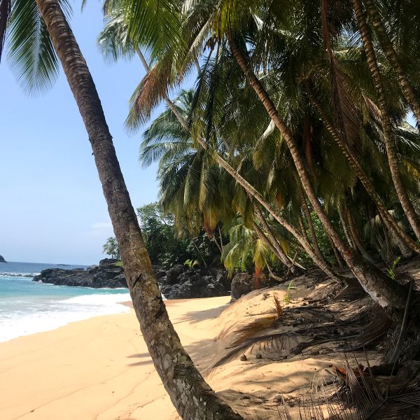 This beach sits on the southern coast of São Tomé, where sand meets the ocean along a forested shoreline. Palms grow close to the waterline and provide shade in places. The water stays warm throughout the year. The setting combines access to the sea with the tropical vegetation that covers much of the island, from coastal areas to inland rainforest. This beach forms part of the natural landscape that defines São Tomé, alongside volcanic peaks, waterfalls, and old cocoa estates further inland.