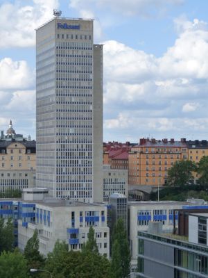 The building serves as a central landmark at Stockholm's southern entrance, reflecting the city's transition toward vertical corporate architecture in the 1950s.