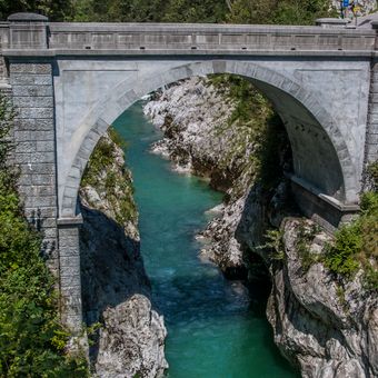 The Napoleon Bridge spans across the Soča River, connecting two sides of the valley with its sturdy stone construction near the town of Kobarid.