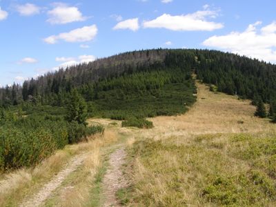 The Andrejcová summit rises to a considerable elevation within the Low Tatras mountain range, offering views across the surrounding valleys and forests.