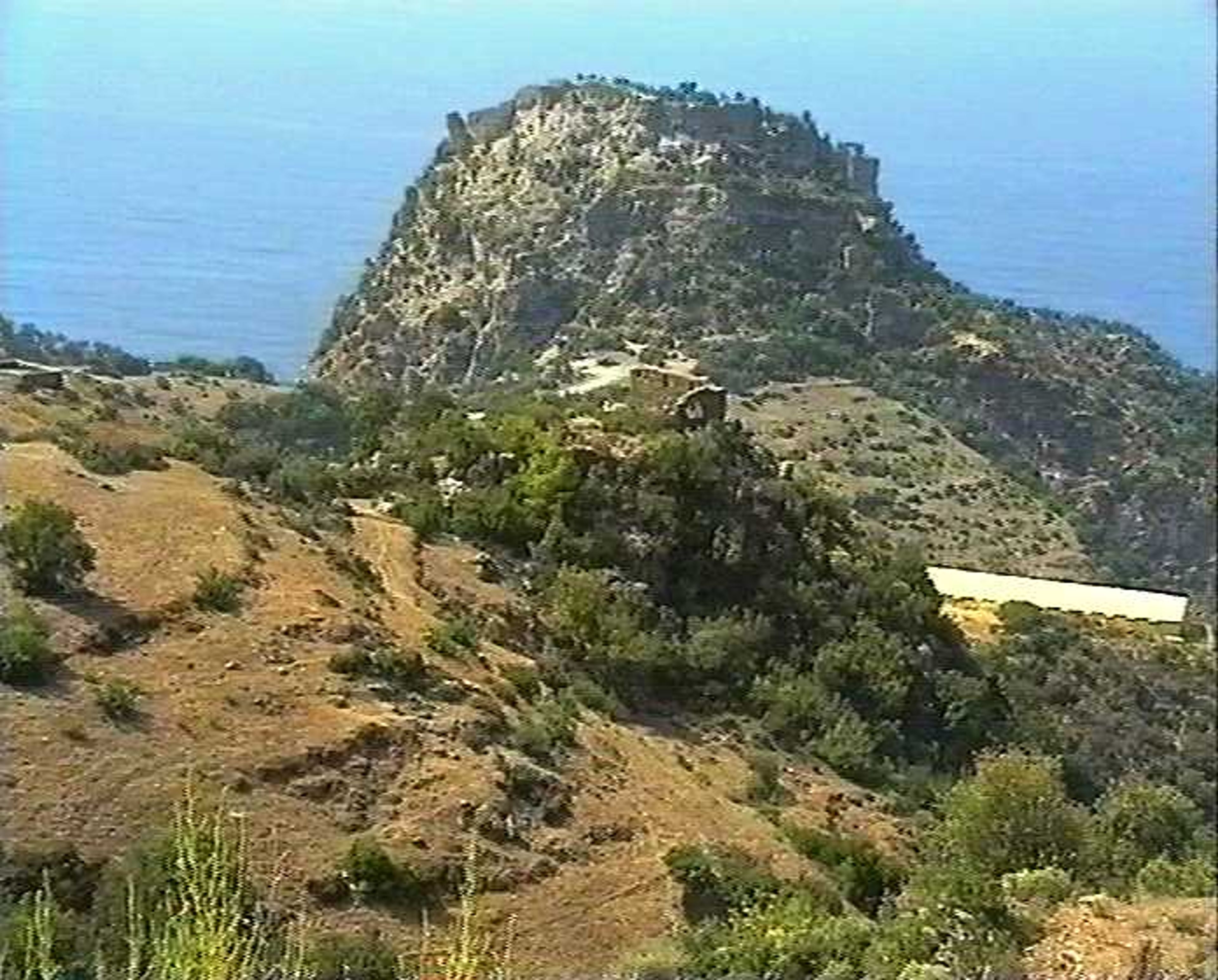 The archaeological site contains fortifications, baths, chapels, a Roman necropolis, and multiple structures spread across Mount Cragus overlooking the Mediterranean Sea.