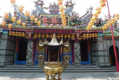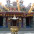 The temple exhibits traditional Chinese architectural elements with stone carvings, painted pillars, decorative roof tiles, and ornamental dragon sculptures throughout its structure.
