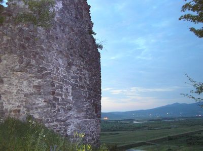 The stone castle remains stand atop a hill near the Tisza River, displaying thick defensive walls and strategic observation points throughout its structure.