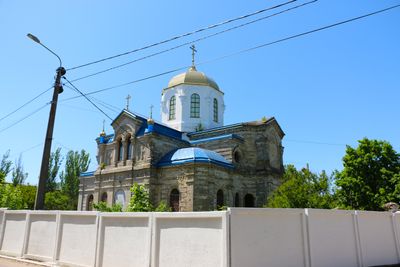 The building features a central dome, traditional Orthodox crosses, and white walls that contrast with decorative architectural elements along its exterior surfaces.