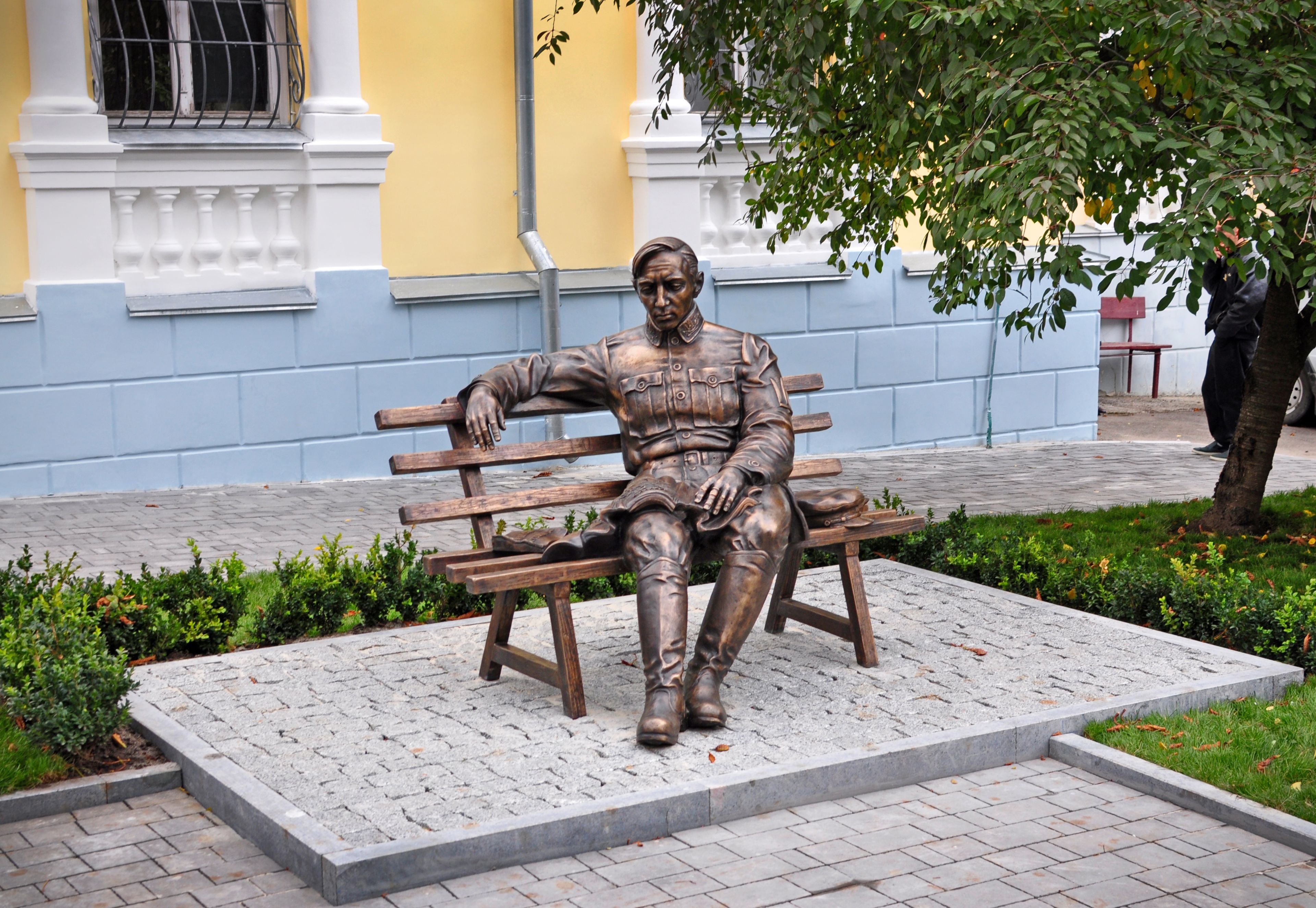 The bronze monument depicts Symon Petliura in military uniform standing upright with his right hand positioned near his heart.