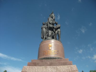 The Young Guard memorial complex features stone sculptures and architectural elements designed by Aleksandr Sidorenko in the socialist realism style.