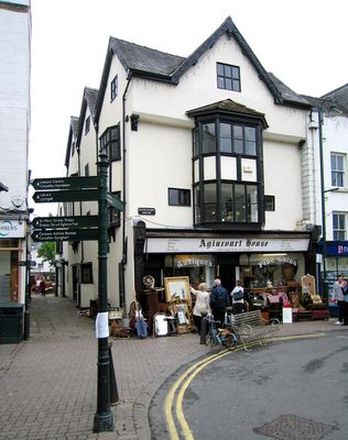 The timber-framed Agincourt House stands at 25.6 meters elevation with a two-storey oriel window facing Agincourt Square in central Monmouth.