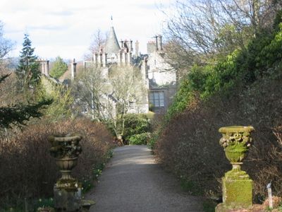 The mansion forms part of a designated landscape that includes formal gardens, botanical specimens, and the Dawyck Chapel within its historical grounds.