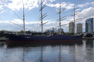 The Moshulu, a four-masted steel barque measuring 359 feet in length, operates as a fine dining establishment on the Delaware River waterfront.