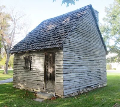 The 1753 House stands as a regulation settler's home replica with wooden beams, split shingles, and a central stone fireplace in Field Park.