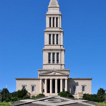 The George Washington Masonic National Memorial rises as a 101-meter tower over Alexandria, combining neoclassical, Romanesque Revival, Gothic Revival and Renaissance elements. Its ten floors contain exhibition rooms, ceremonial halls and a library holding masonic historical documents.