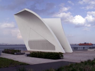 The Postcards Memorial features two white marble wings rising 30 feet high along the St. George Esplanade near New York Harbor.