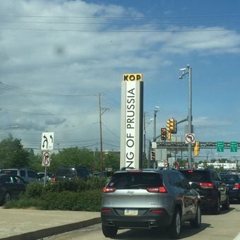 King of Prussia is a settlement in Montgomery County northwest of Philadelphia with housing developments, shopping centers, and office parks. The streets follow mostly grid patterns interrupted by older country roads and newer highway sections.