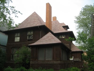 Frank Lloyd Wright designed this house in 1895 for Charles E. Roberts as part of an economical homes project, though construction finished in 1898 for a Marshall Field salesman.