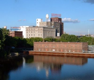 Hennepin Island Hydroelectric Plant is a power station located on the Mississippi River at St. Anthony Falls, using the river's natural water flow to produce electricity. The facility contains five generating units housed within a substantial industrial brick structure built directly on an island in the river.