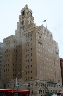 The Plummer Building is a 15-story hospital in Rochester featuring Art Deco architecture, marble surfaces, and bronze doors that reflect the period's design standards. A distinctive terra-cotta bell tower anchors the structure and serves as a visual landmark for the downtown area.