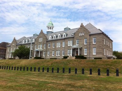 The Flemish-style structure contains four corner sections with officers' quarters and a central area for classrooms, library, and administrative offices.
