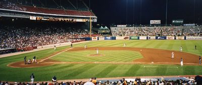 The multi-purpose stadium featured a double-deck grandstand along the foul lines, extending to lower seating that reached the foul poles and outfield bleachers.
