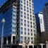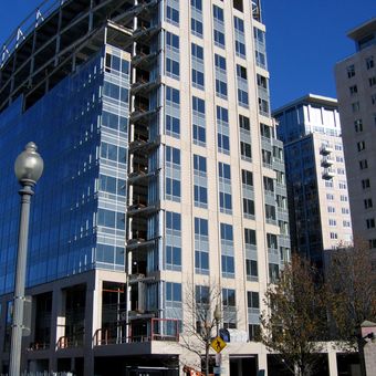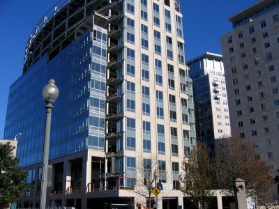 The blue glass tower rises 237 feet above Exchange Street, featuring 13 floors of office space and a connected parking structure below.