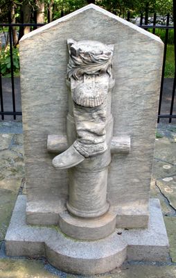 A white marble monument featuring a howitzer barrel adorned with a military riding boot and two-star epaulette stands 4 feet tall.