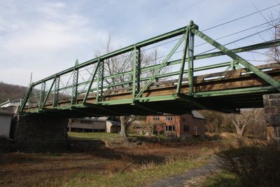 The Bridge in Tinicum Township spans across the Delaware Canal with a Pratt pony truss design featuring steel construction and wooden elements.