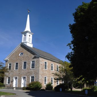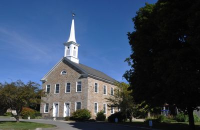 The fieldstone church building measures 50 feet by 40 feet, featuring 2-foot-thick walls, a slate roof, and a rectangular steeple with spire.