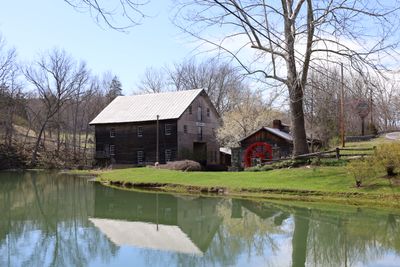 The mill complex includes a two-and-a-half-story building with hand-hewn post-and-beam construction, featuring massive timbers connected through mortise and tenon joints.
