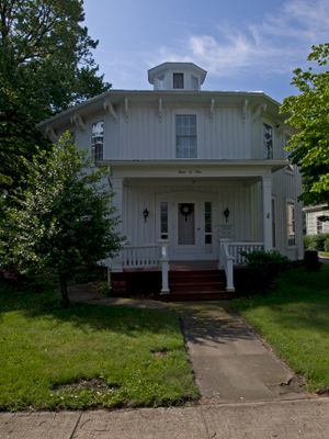 The David Cummins Octagon House stands at 301 Liberty Street, featuring an eight-sided architectural design that sets it apart from conventional houses.