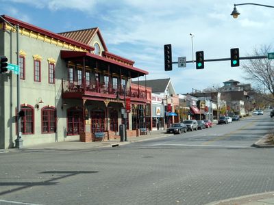 Dickson Street features numerous restored commercial buildings, restaurants, music venues, and art galleries spread across several blocks in downtown Fayetteville.
