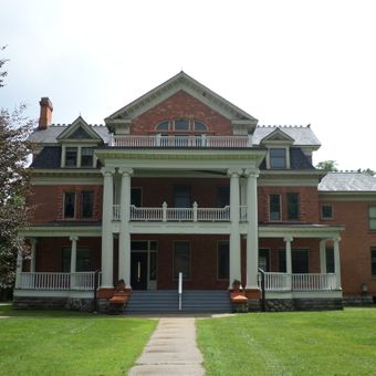 The Dodge Mansion displays classical architectural elements with ornate stone carvings and multiple gabled roofs across its detailed exterior facade.