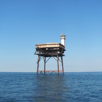 This structure was an early example of a Texas Tower, a modern steel platform design created specifically for offshore locations like this one. The system made it possible to place a lighthouse where traditional tower construction was impossible.