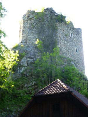 Burgruine Lichtenhag is a castle ruin in Gramastetten featuring a pentagonal residential tower with Gothic door and window frames set within stone walls. The site sits on a steep ridge that overlooks the Great Rodl Valley below.