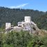The castle remains include exterior walls, towers, and architectural elements situated on a hilltop in Lower Austria's mountainous region.