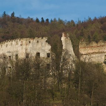 The castle remains contain massive stone walls from the 12th to 16th centuries, featuring a round-arched gate and several arrow-slit windows.