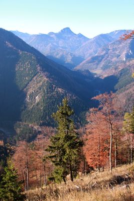 The Großer Sonnleitstein rises to 1,639 meters in the Mürzsteg Alps, featuring a narrow rocky ridge and steep slopes on its flanks.