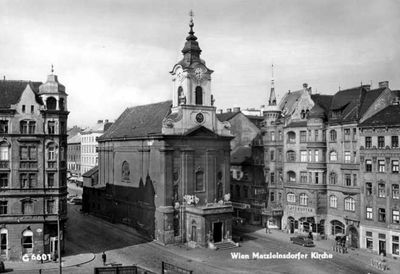 The Florianikirche stands at the intersection of traditional architecture with its stone facade and prominent tower in the Margareten district of Vienna.
