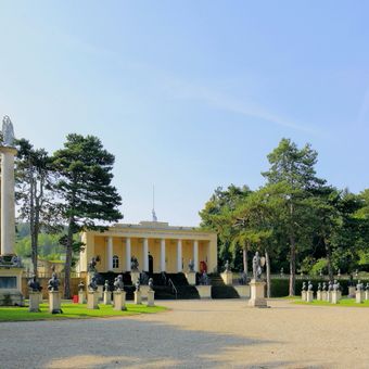 The Heldenberg Memorial features statues and busts of Austrian rulers and military figures within an open-air pantheon at Kleinwetzdorf castle grounds.