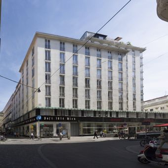 The main entrance on Herrengasse is the best reference point when approaching the building for the first time. The ground floor with its shops and coffee bar is open to the public, while the residential floors above are private.