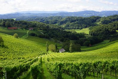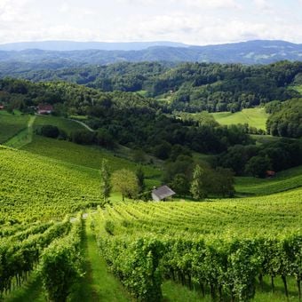 The Tement winery extends across steep slopes with vineyards spanning both Austrian and Slovenian territories, specializing in Sauvignon Blanc production.