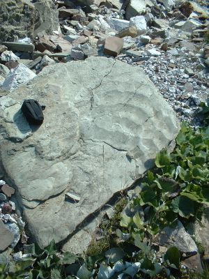 The rock layers contain marine fossils including mollusks, ammonites, ostracods, and brachiopods from an ancient tropical sea environment.