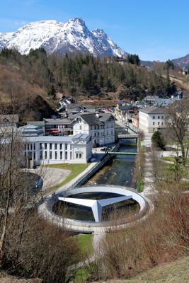 The Mercedes-Brücke is a pedestrian bridge that crosses above the confluence of the Grundlseertraun and Altausseertraun rivers while forming the shape of a Mercedes star. The structure spans about 27 meters and allows visitors to look down at the river and surrounding landscape from multiple vantage points.
