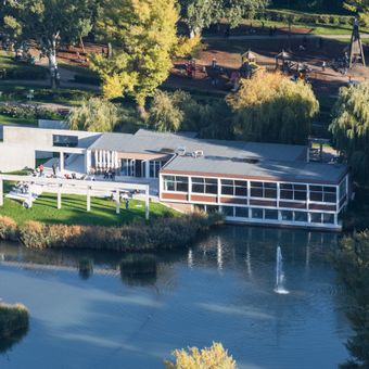 The structure represents one of the few examples of leisure architecture from Vienna's post-war modernism period, with vertically lifting windows on the upper floor.