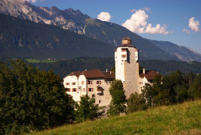 Schloss Friedberg rises on a hill with Gothic architecture, stone walls, and fortified towers overlooking the Inn Valley and surrounding mountains.