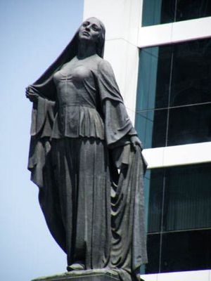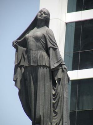 The Statue of a Liberated Woman stands with raised arms, representing female empowerment through its bronze construction and commanding presence in the city landscape.
