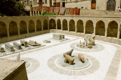 Located north of the Maiden Tower, Bazar Square contains stone pavement structures and a cylindrical well surrounded by traditional architecture.