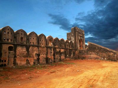 The fort's architecture incorporates traditional Mughal military design elements, including musketry holes, rampart walkways, and a decorative lotus finial gateway.