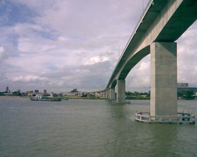 The bridge is designed to allow large river boats to pass under it safely, so water traffic continues to flow alongside road traffic. Keep in mind this is an active transport route used heavily by vehicles and trucks moving goods between regions.
