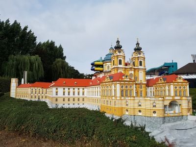 Mini-Europe displays 350 architectural models representing European landmarks at a precise scale of 1:25, including detailed replicas of monuments and buildings.