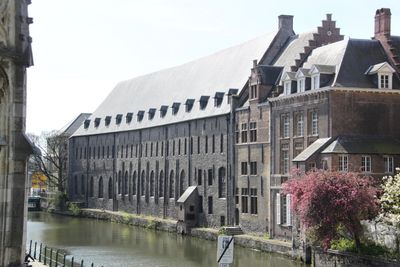 Het Pand extends along the Leie River with multiple auditoriums, meeting spaces, and exhibition areas across its medieval architecture complex.
