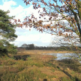 De Maten is a nature reserve spanning several hundred hectares across the border of two municipalities, with water meadows, sandy heaths, woodlands, and connected ponds supporting diverse ecosystems. The different habitats create distinct zones where various plants and animals thrive in conditions suited to wetland and upland species.